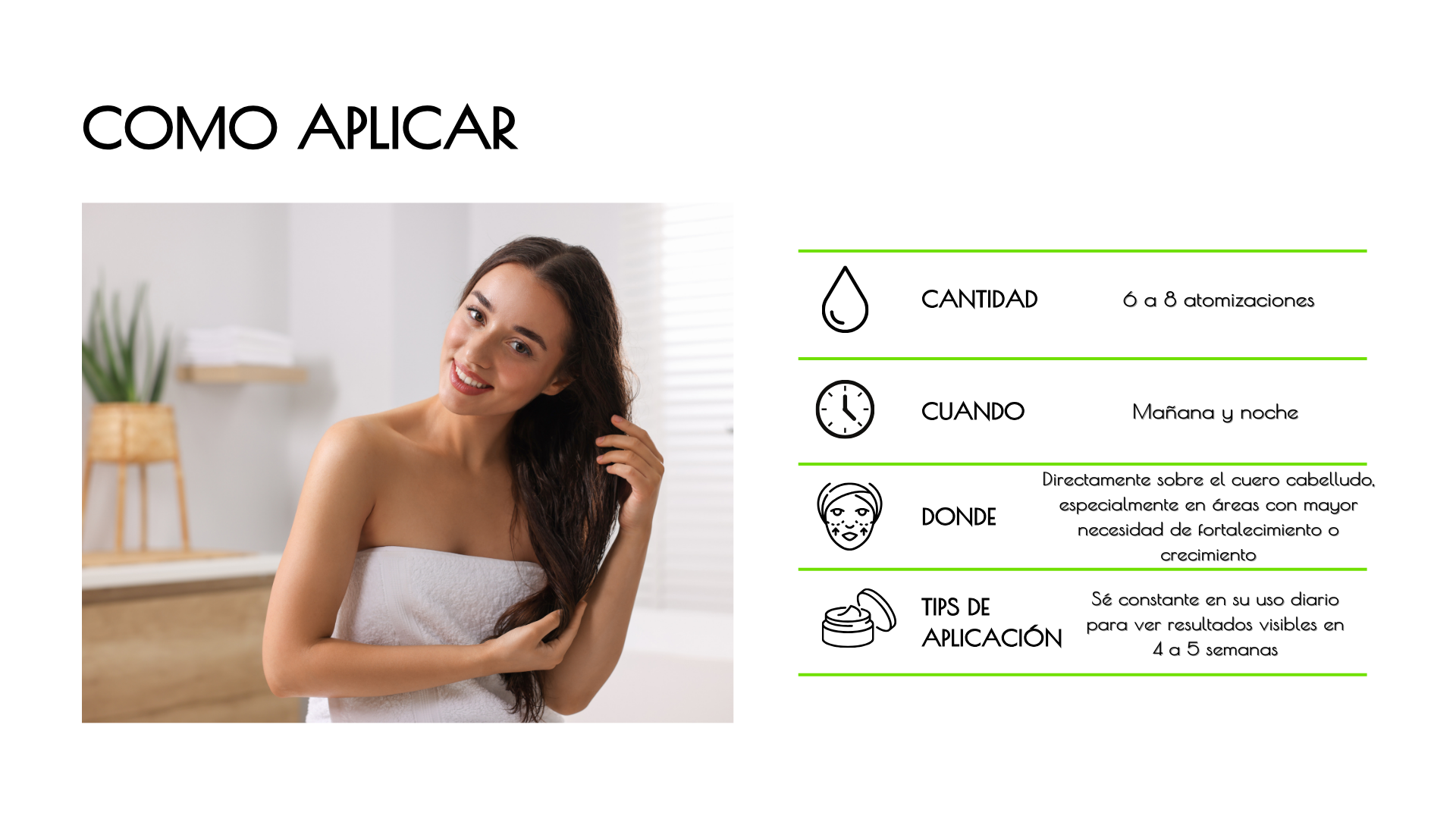 Tratamiento intensivo en Spray Fortalece la estructura del cabello, 6 a 8 atomizaciones en la mañana y en la noche.