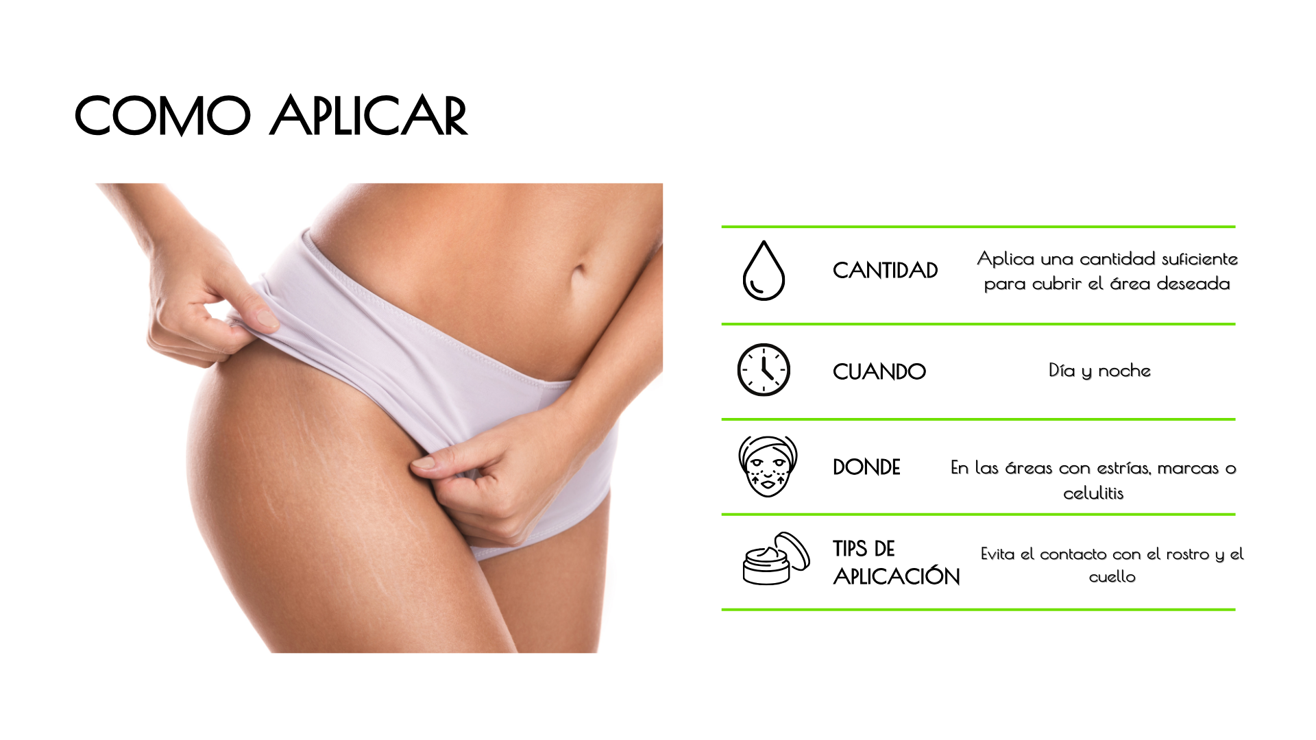 Modo de uso: Aplica el producto en la zona a tratar, día y noche, con movimientos circulares hasta que se absorba completamente. Los resultados visibles en las estrías comienzan a aparecer después de 4 semanas de uso constante.
