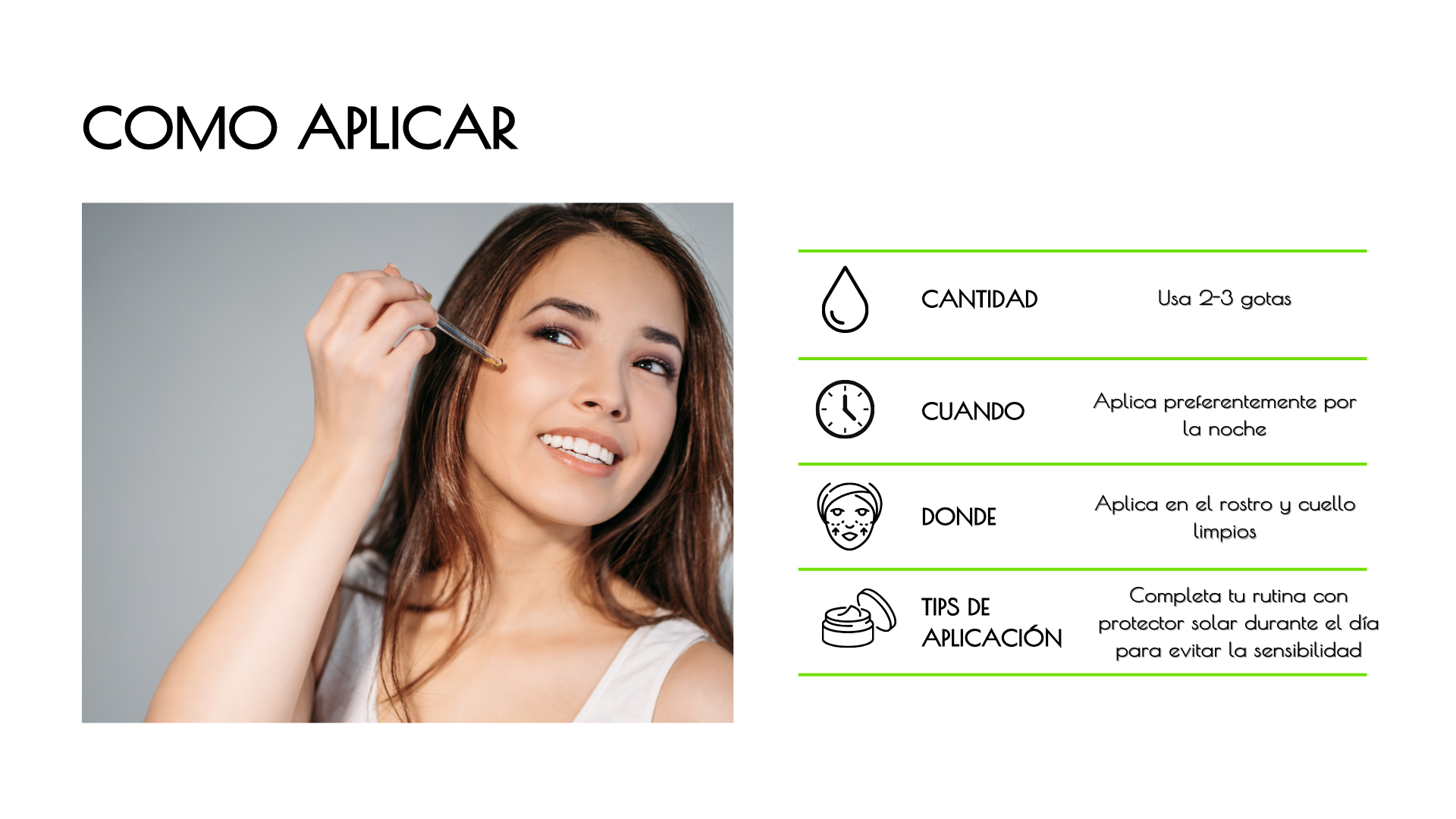 Aplica una pequeña cantidad del sérum sobre el rostro limpio y seco, evitando el área de los ojos. Distribuye uniformemente con movimientos suaves y deja que el producto se absorba completamente. Utiliza el sérum diariamente, preferentemente por la noche, para obtener los mejores resultados.