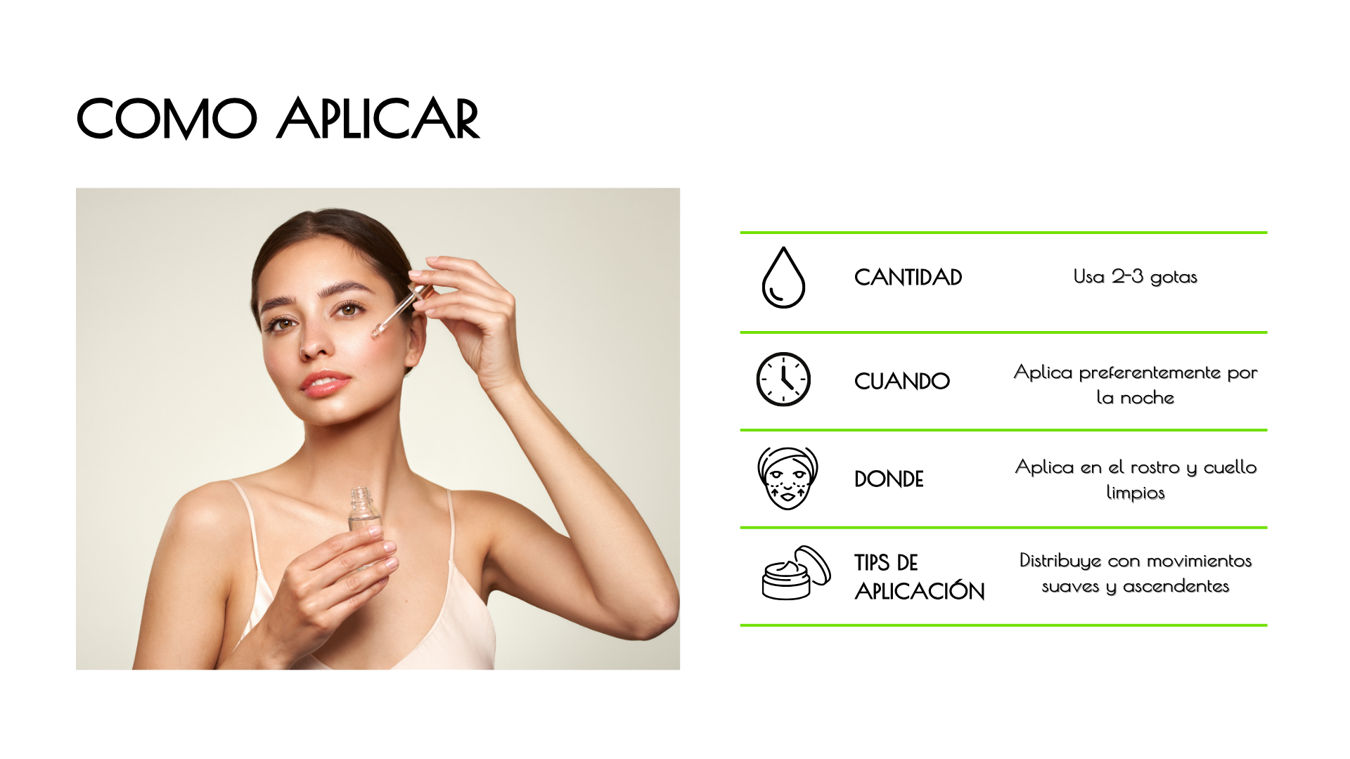 Aplica una pequeña cantidad del sérum sobre el rostro limpio y seco, distribuyendo uniformemente con movimientos suaves. Usa diariamente, preferentemente por la noche, para obtener mejores resultados.