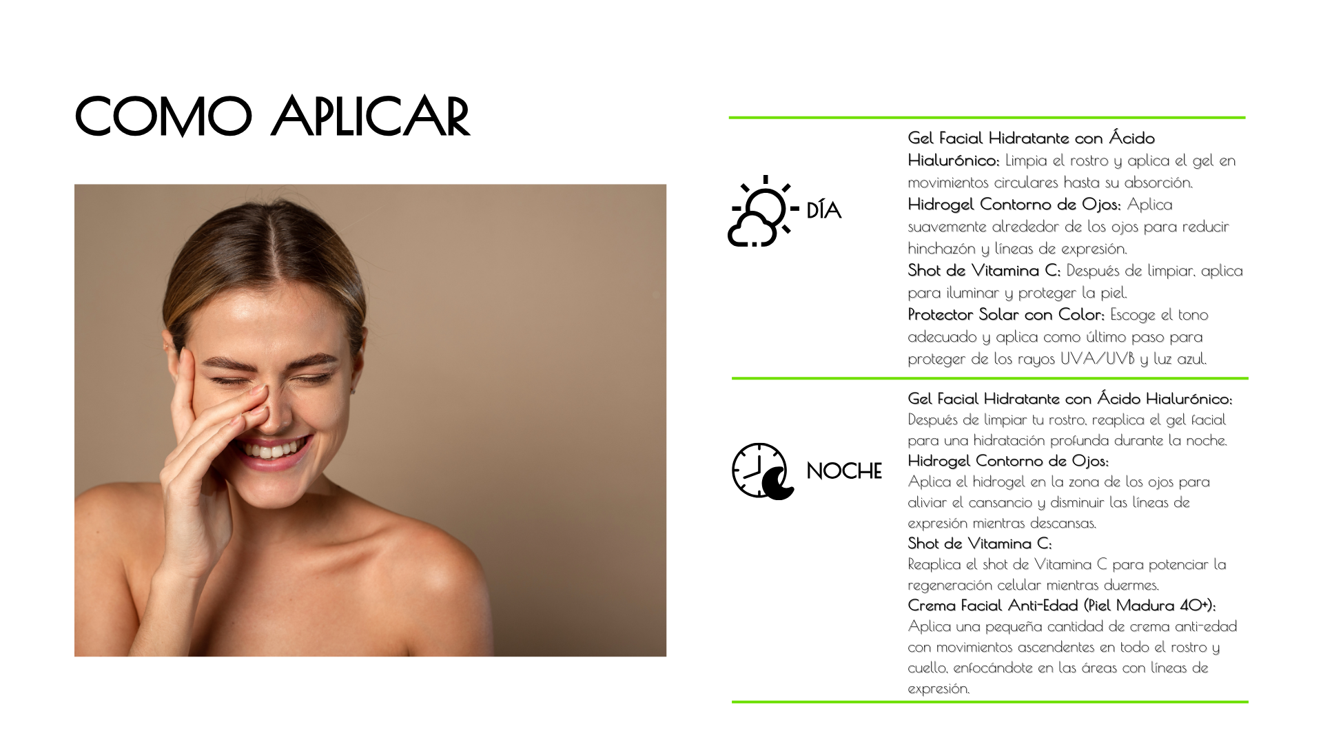 El shot de vitamina C combinado con niacinamida ilumina y unifica el tono de la piel, ayudando a reducir manchas y a revitalizar pieles apagadas, mientras el contorno de ojos reduce ojeras y signos de fatiga.
